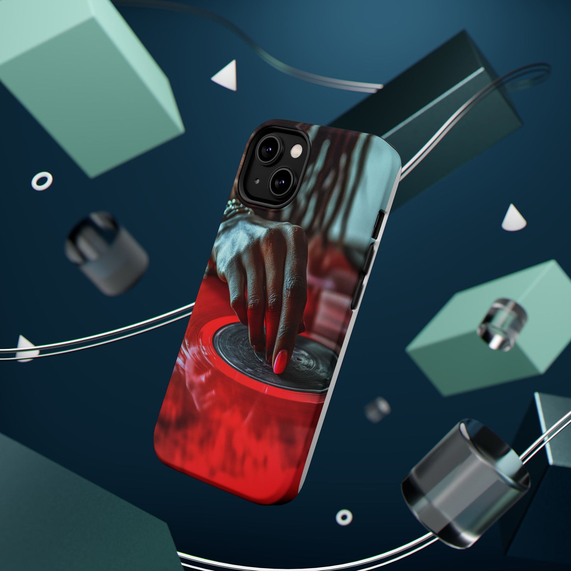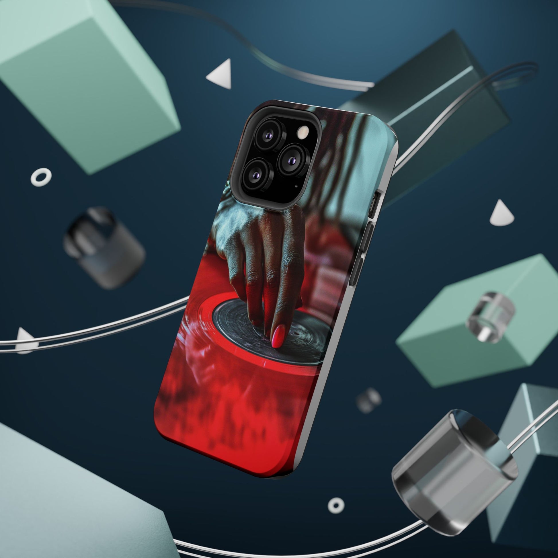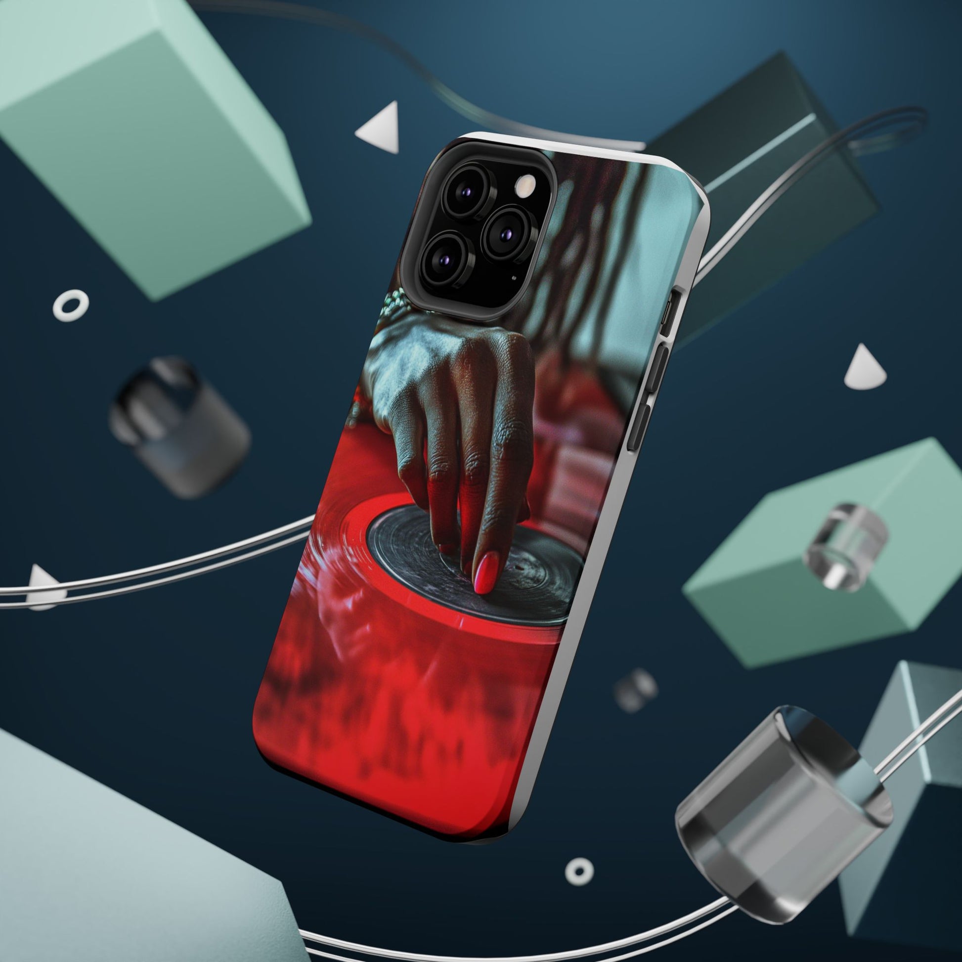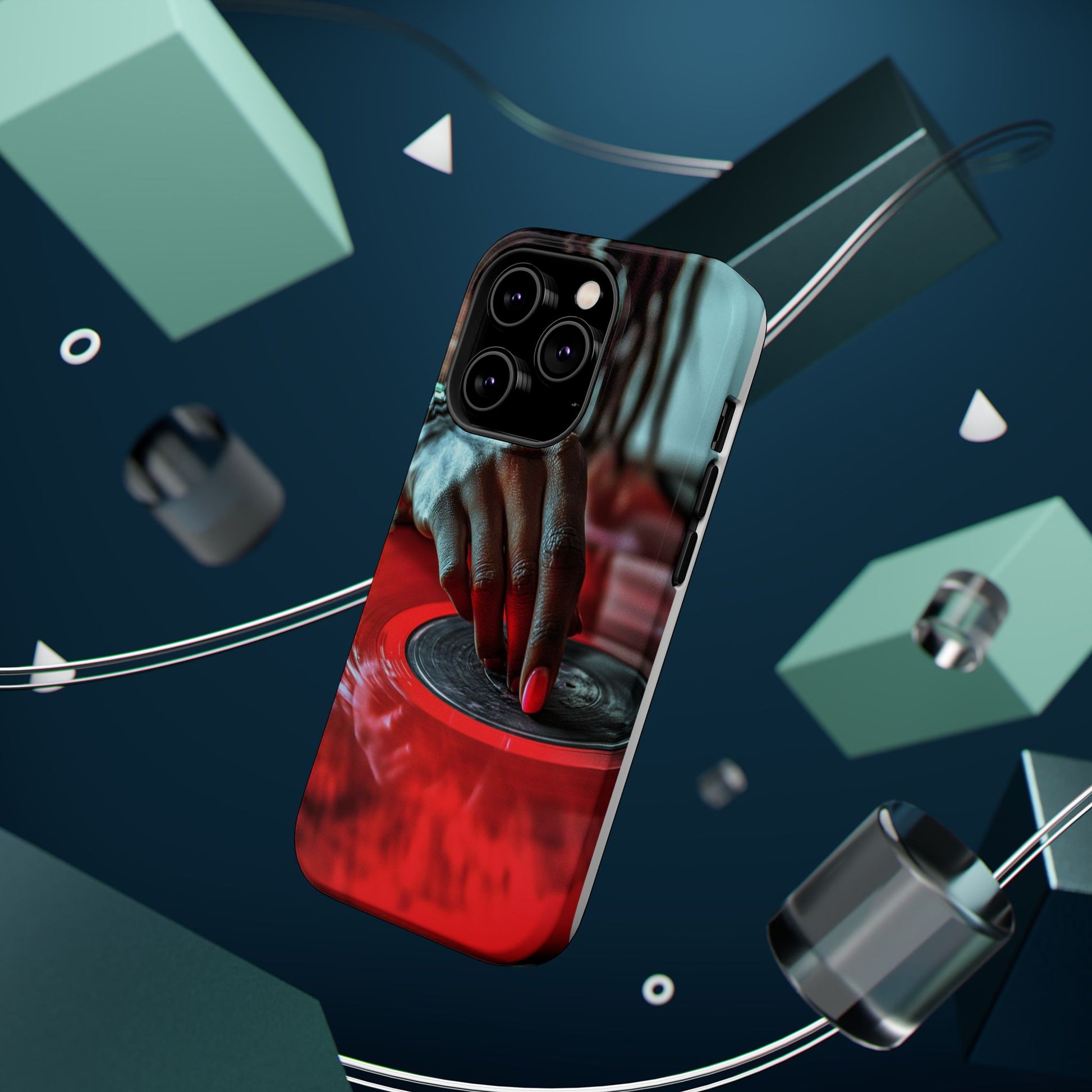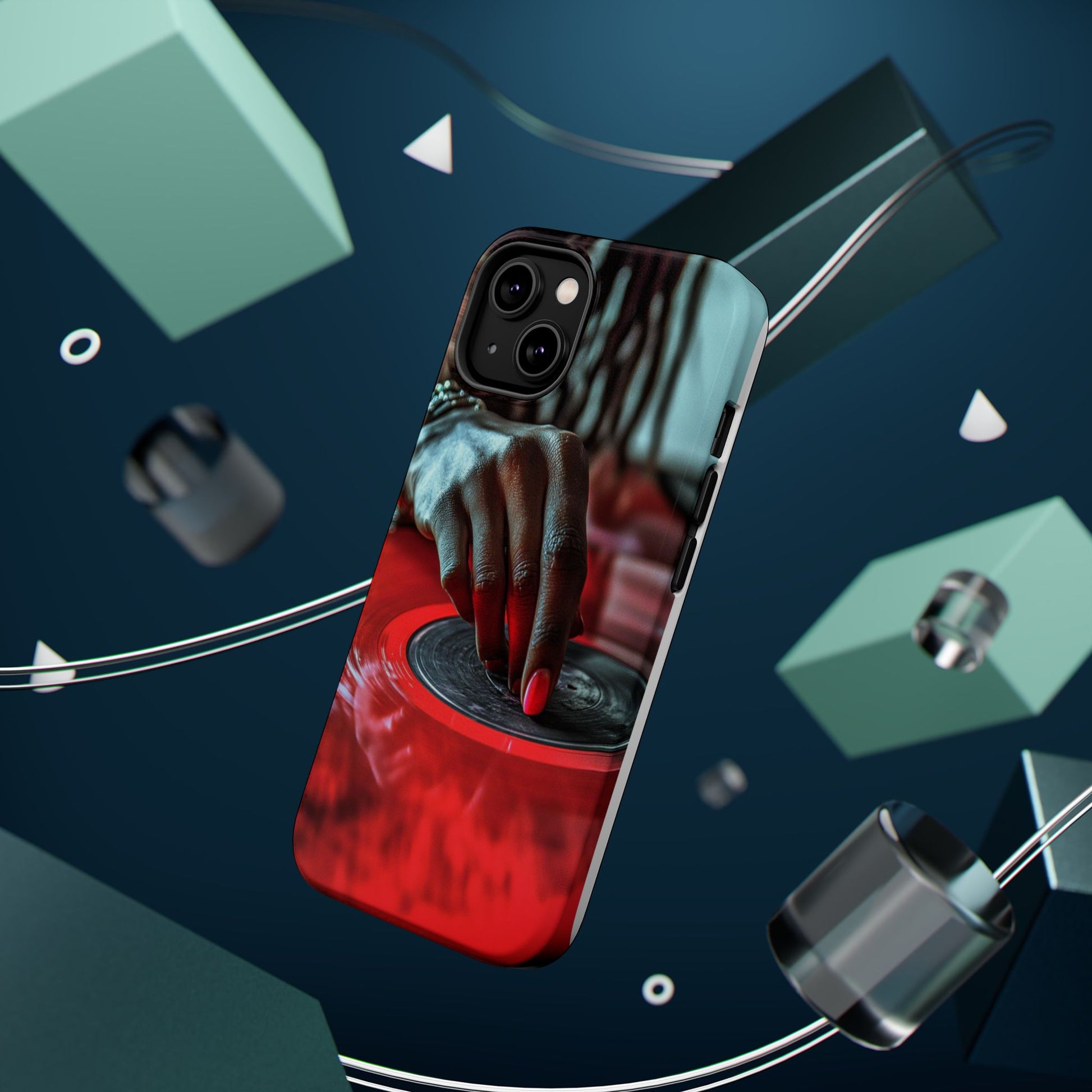 Elevate your iPhone's style with this stunning case featuring Moxie-Jay's captivating artwork "Vinyl Groove." This luxurious case showcases a close-up photograph of a woman's black hand scratching a vibrant red vinyl record, perfectly capturing the essence of music and artistry. The durable polycarbonate construction provides superior protection against scratches and impacts, while the built-in magnets ensure seamless MagSafe® compatibility for effortless wireless charging.This tough iPhone case offers: