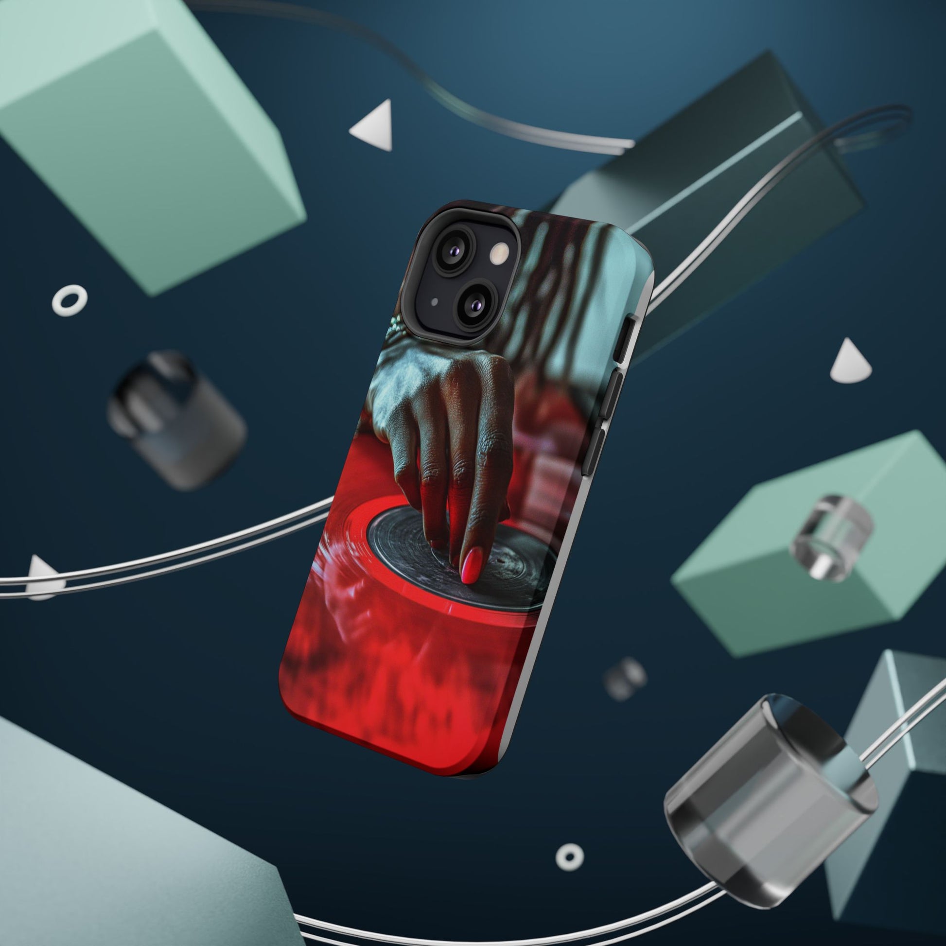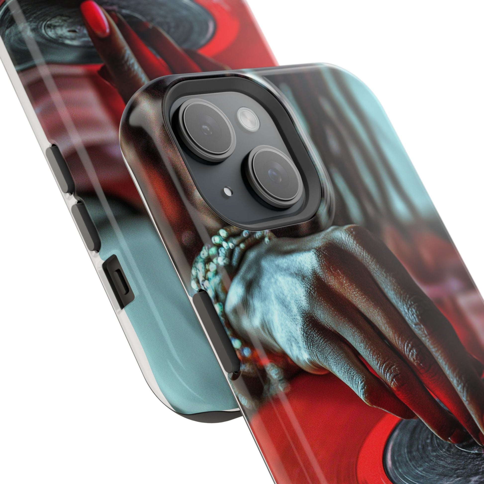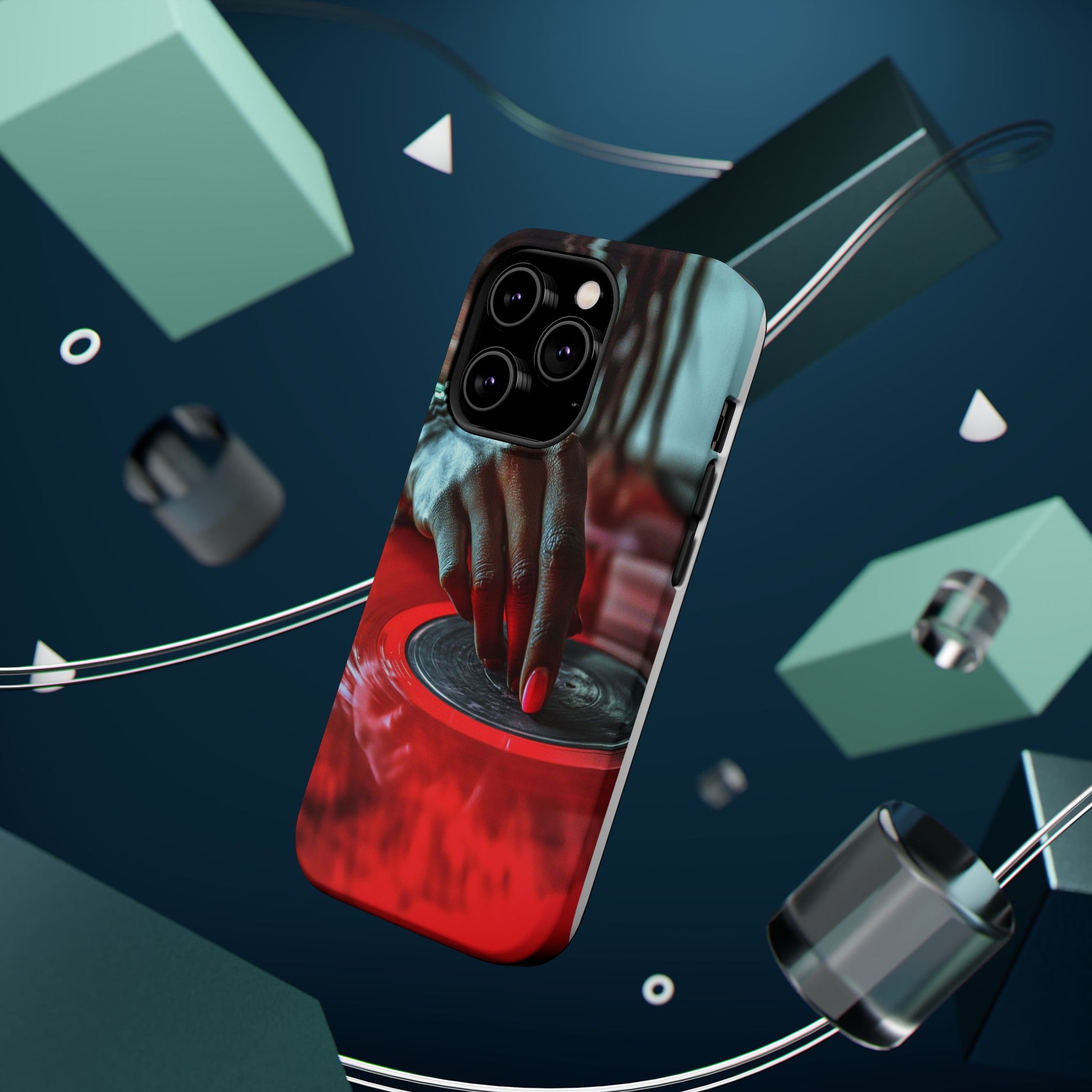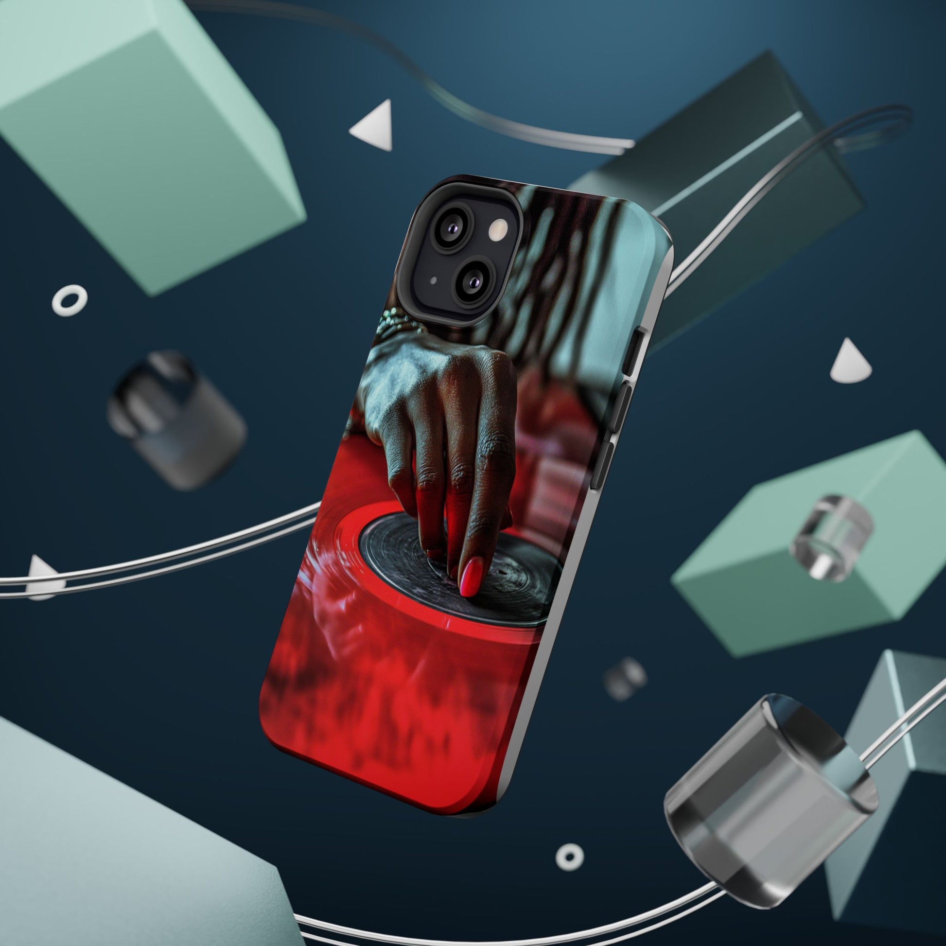 Elevate your iPhone's style with this stunning case featuring Moxie-Jay's captivating artwork "Vinyl Groove." This luxurious case showcases a close-up photograph of a woman's black hand scratching a vibrant red vinyl record, perfectly capturing the essence of music and artistry. The durable polycarbonate construction provides superior protection against scratches and impacts, while the built-in magnets ensure seamless MagSafe® compatibility for effortless wireless charging.This tough iPhone case offers:
