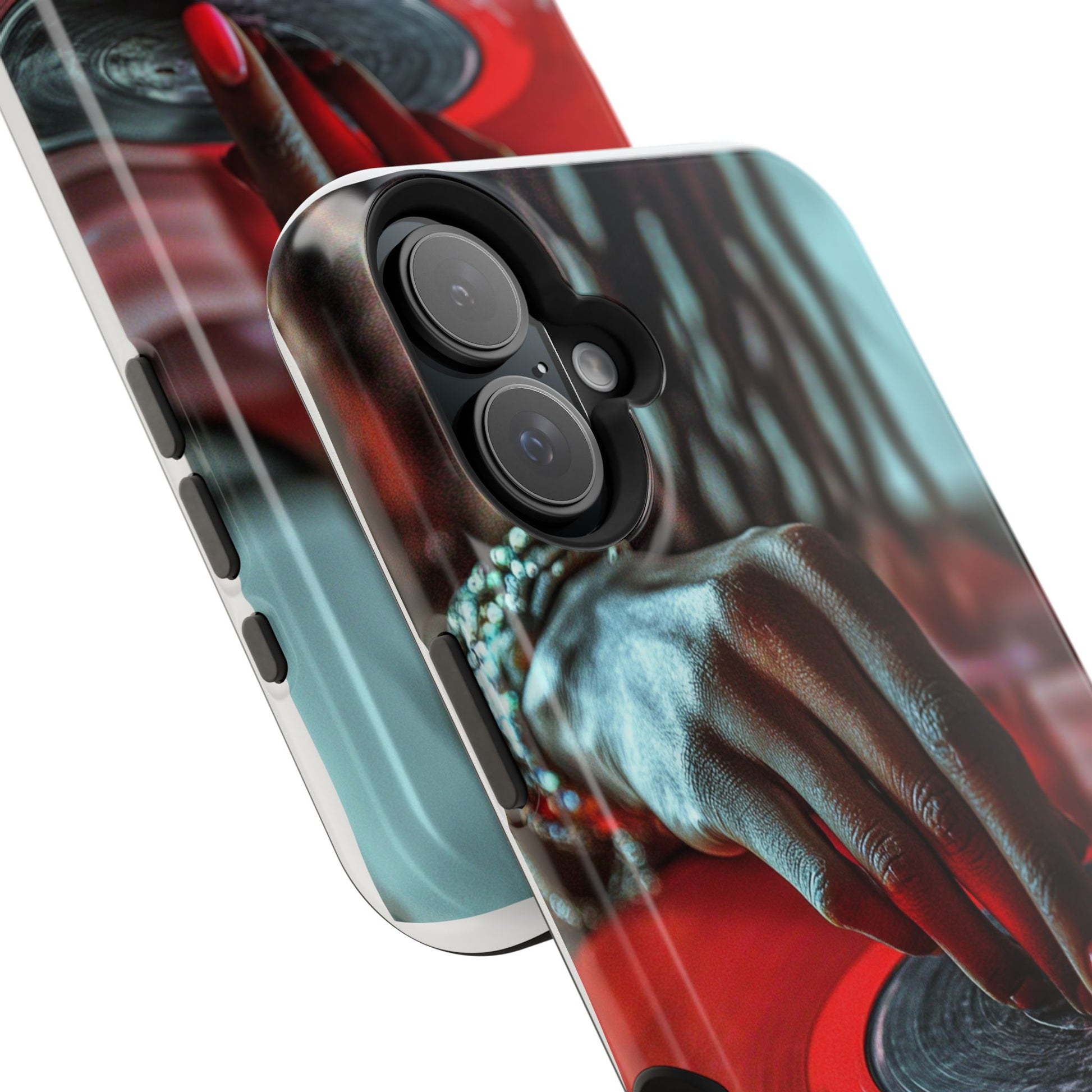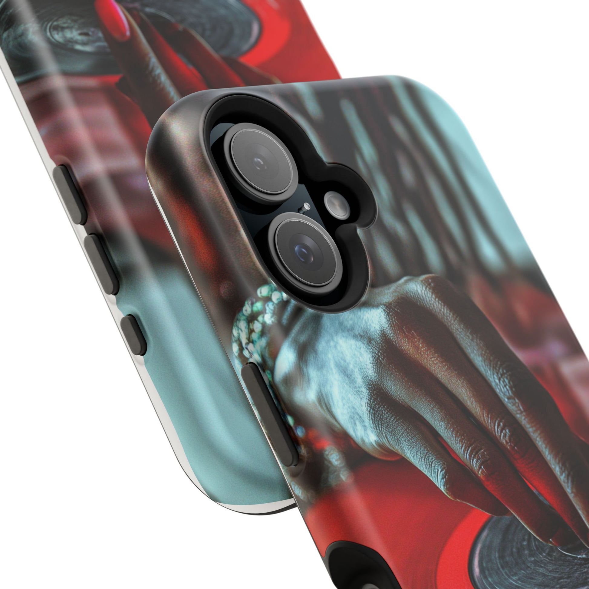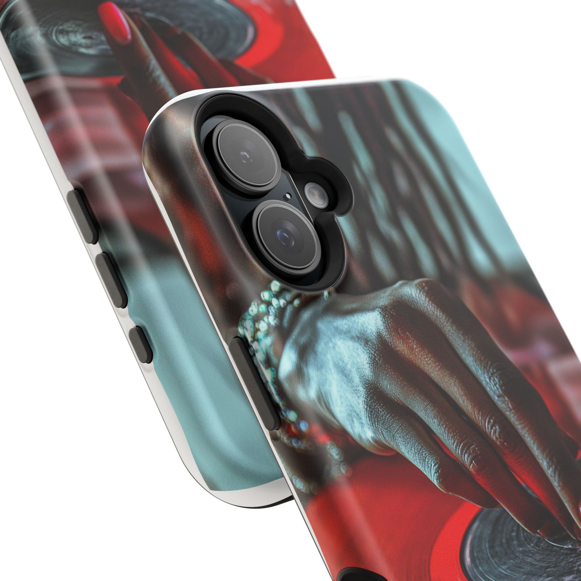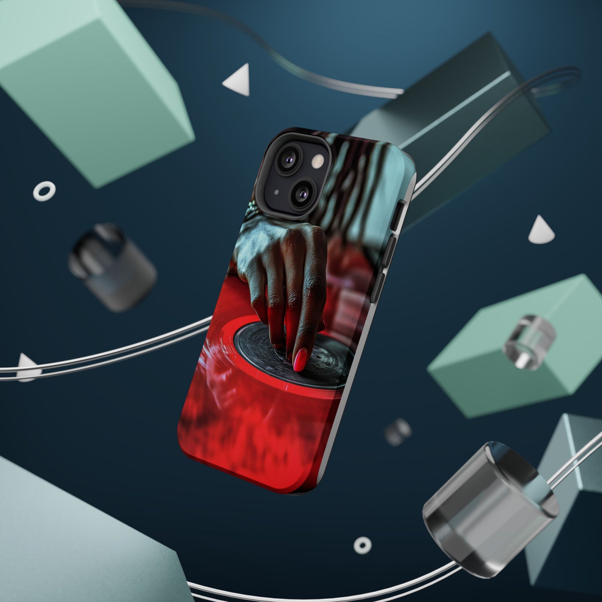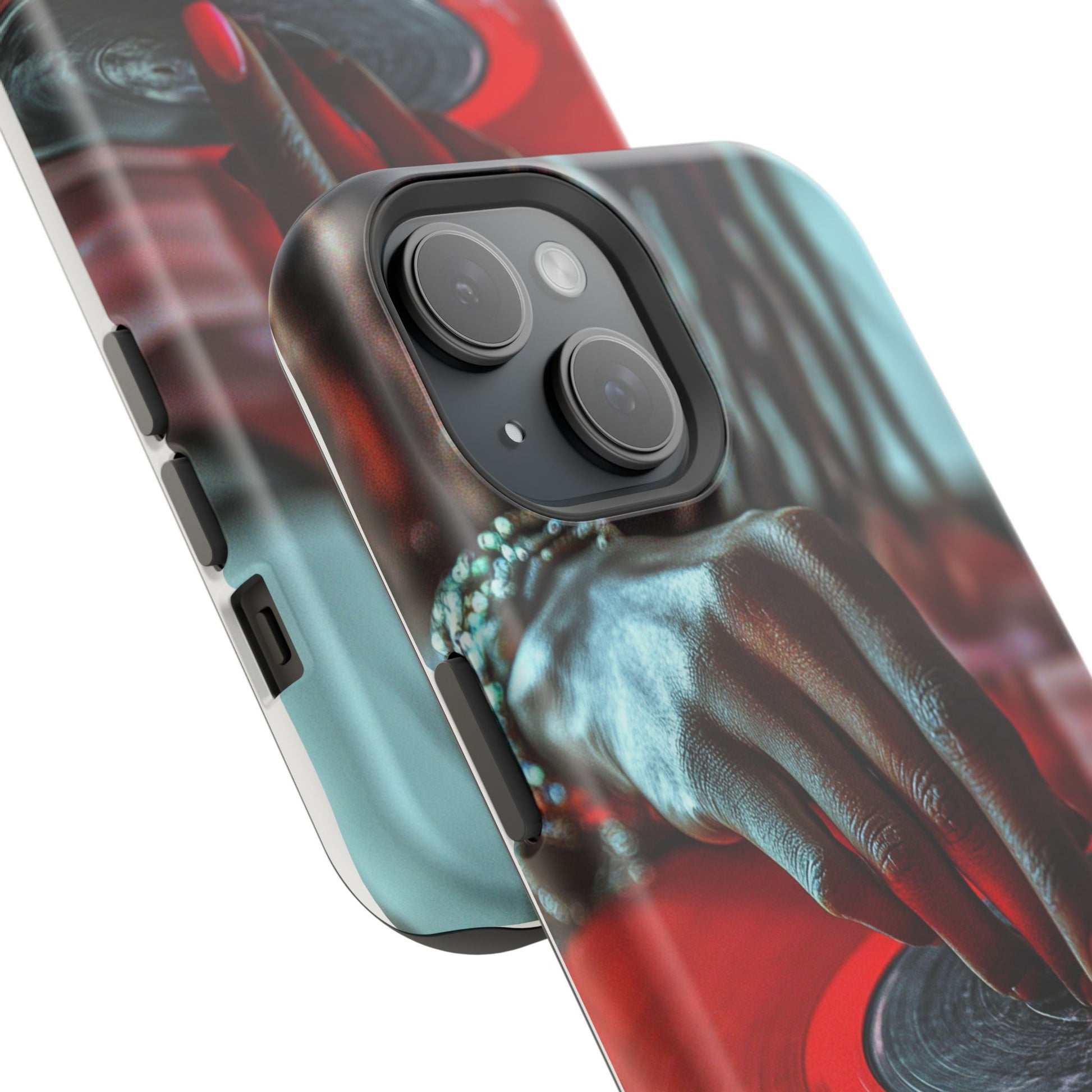 Elevate your iPhone's style with this stunning case featuring Moxie-Jay's captivating artwork "Vinyl Groove." This luxurious case showcases a close-up photograph of a woman's black hand scratching a vibrant red vinyl record, perfectly capturing the essence of music and artistry. The durable polycarbonate construction provides superior protection against scratches and impacts, while the built-in magnets ensure seamless MagSafe® compatibility for effortless wireless charging.This tough iPhone case offers:
