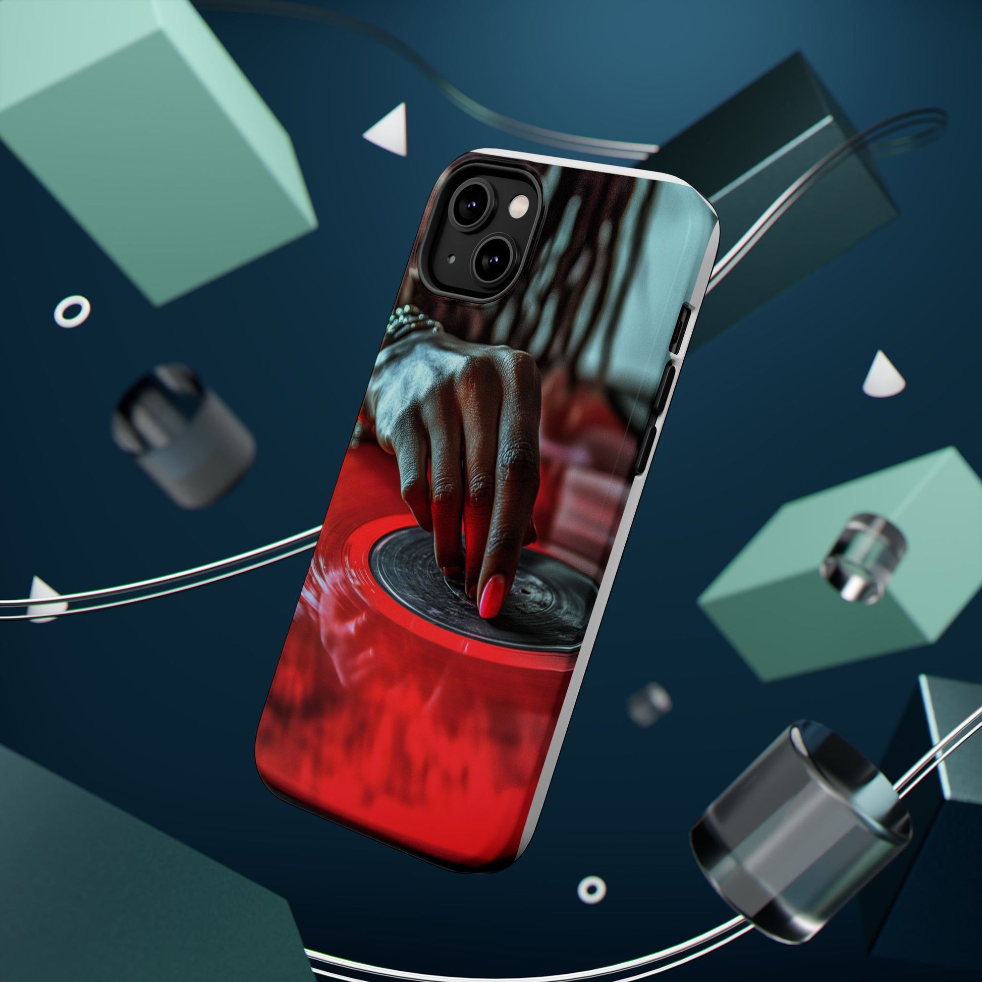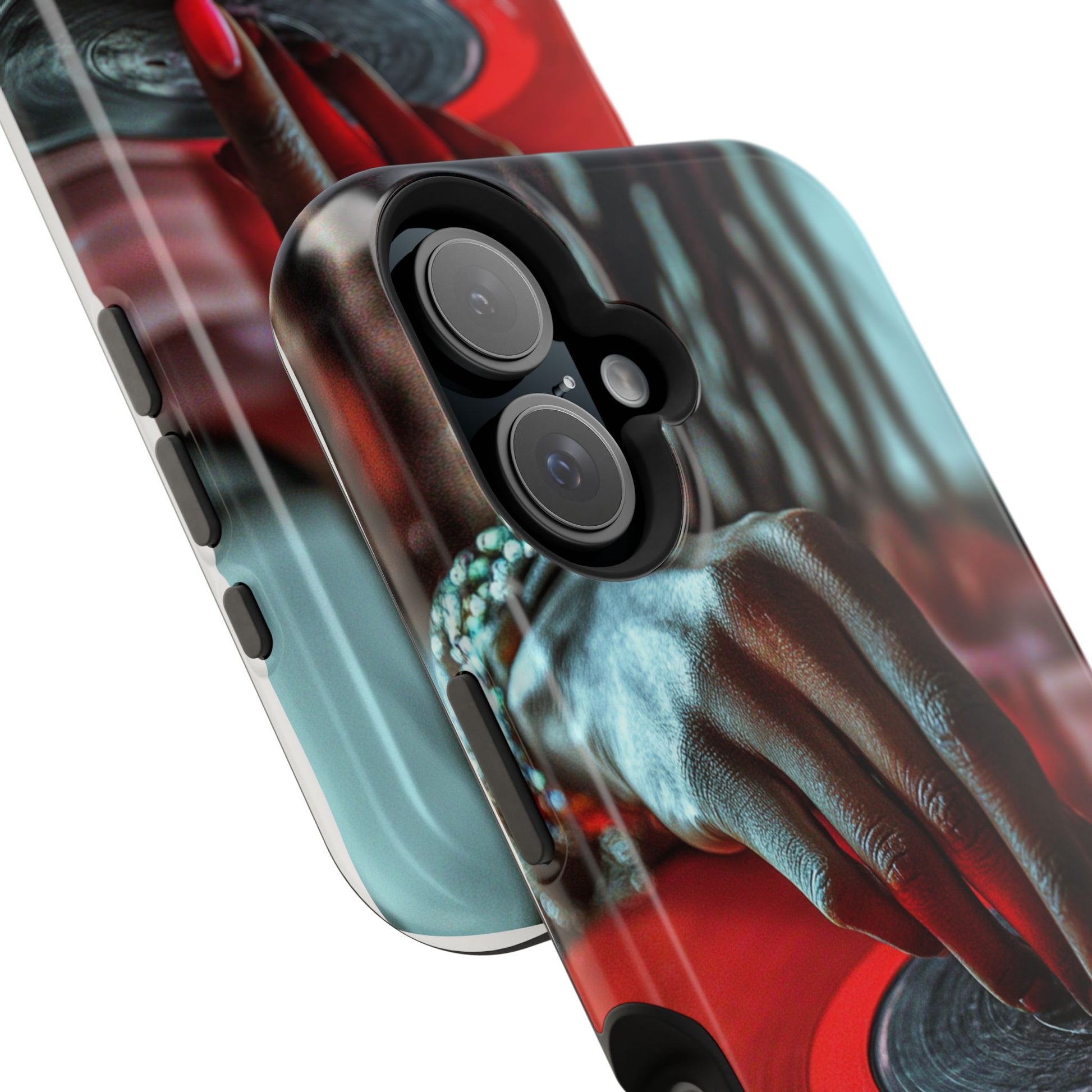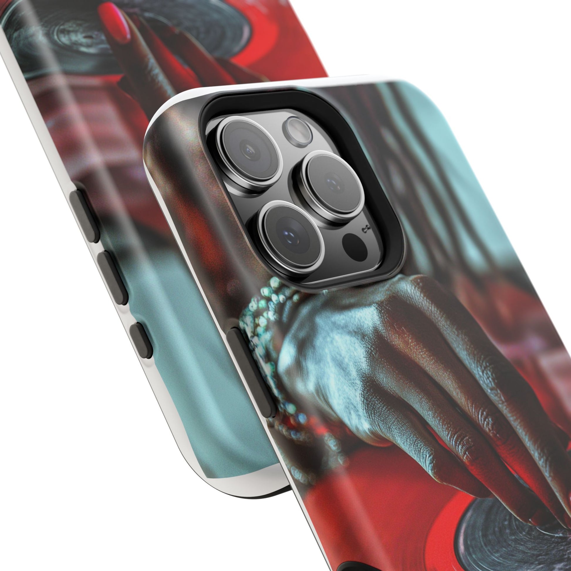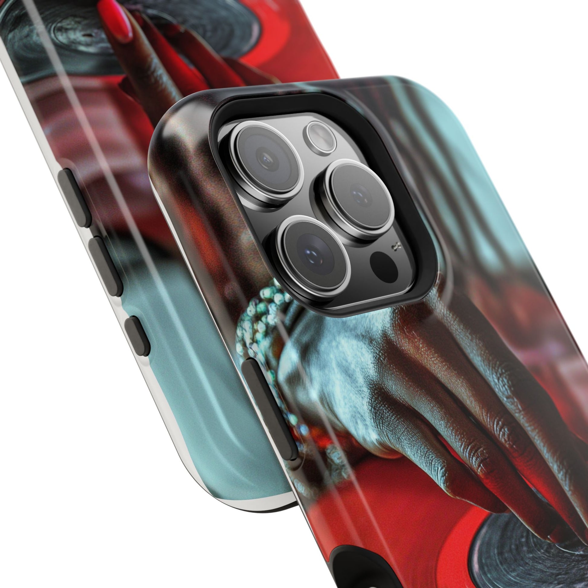 Elevate your iPhone's style with this stunning case featuring Moxie-Jay's captivating artwork "Vinyl Groove." This luxurious case showcases a close-up photograph of a woman's black hand scratching a vibrant red vinyl record, perfectly capturing the essence of music and artistry. The durable polycarbonate construction provides superior protection against scratches and impacts, while the built-in magnets ensure seamless MagSafe® compatibility for effortless wireless charging.This tough iPhone case offers: