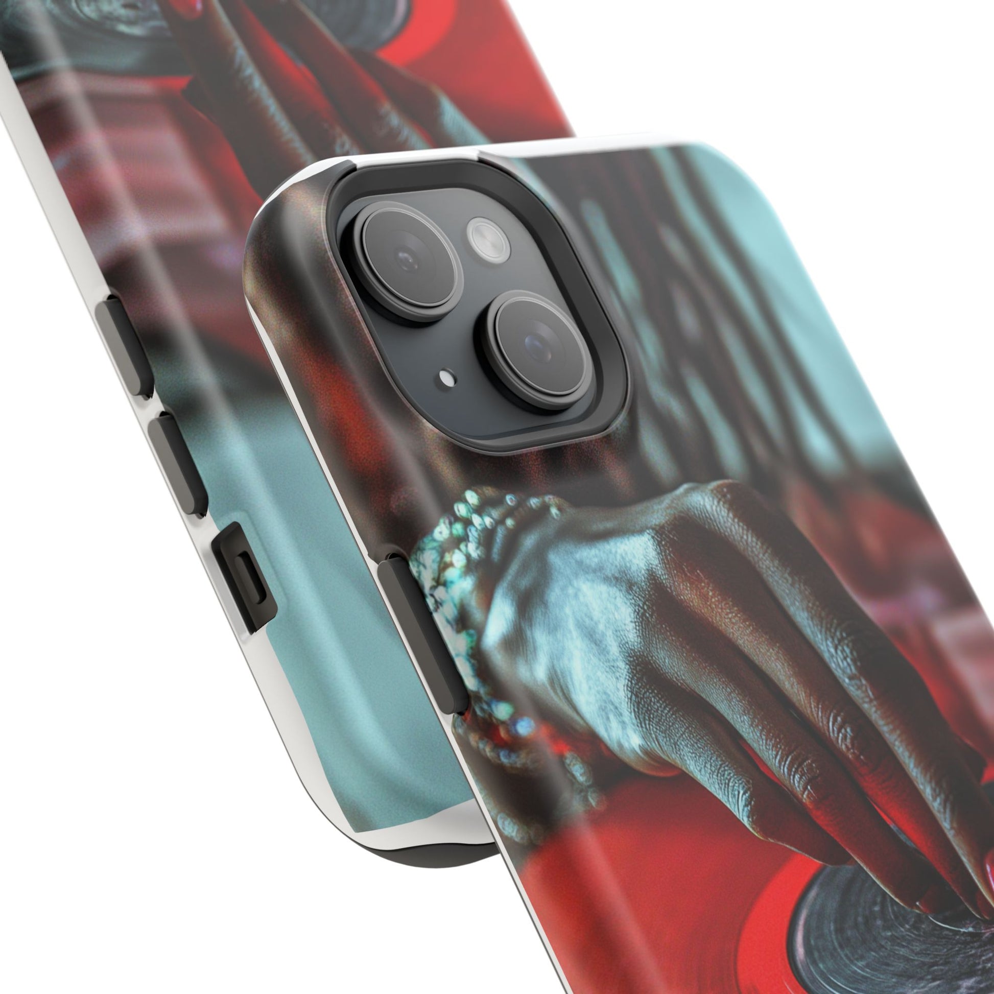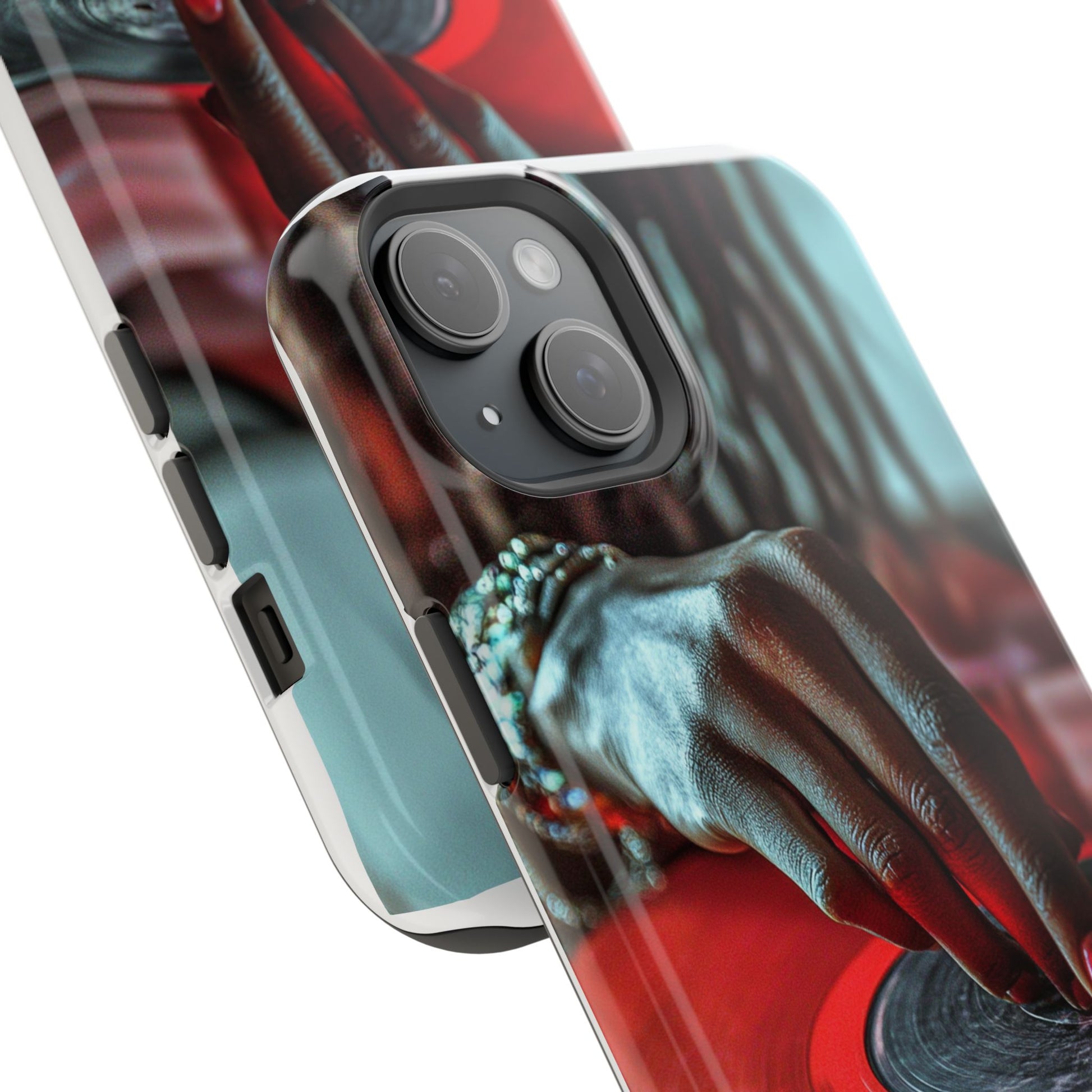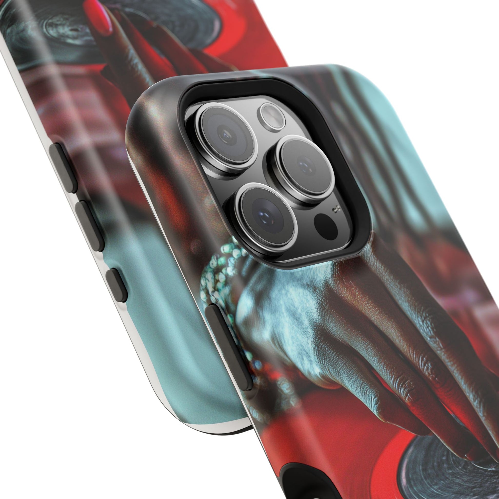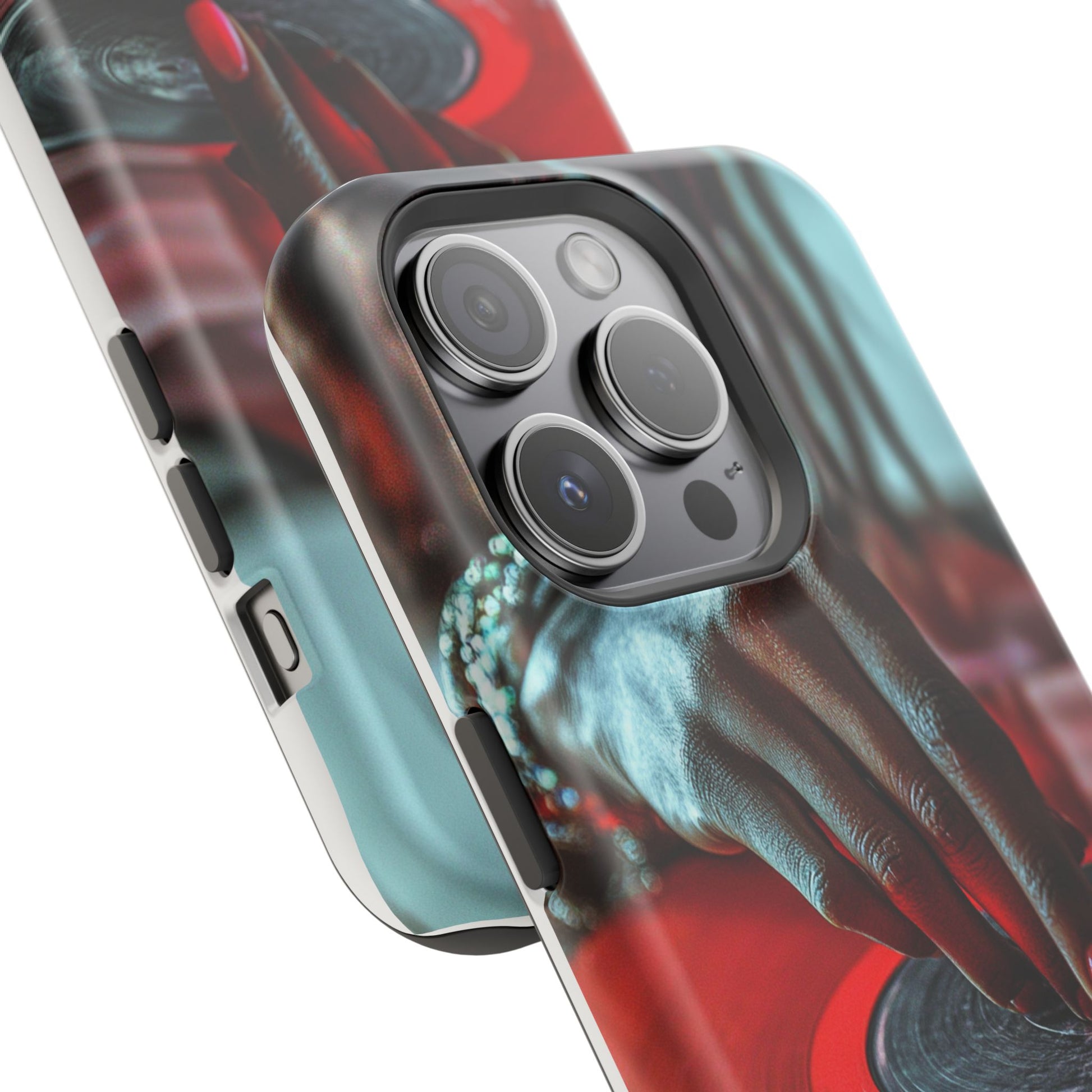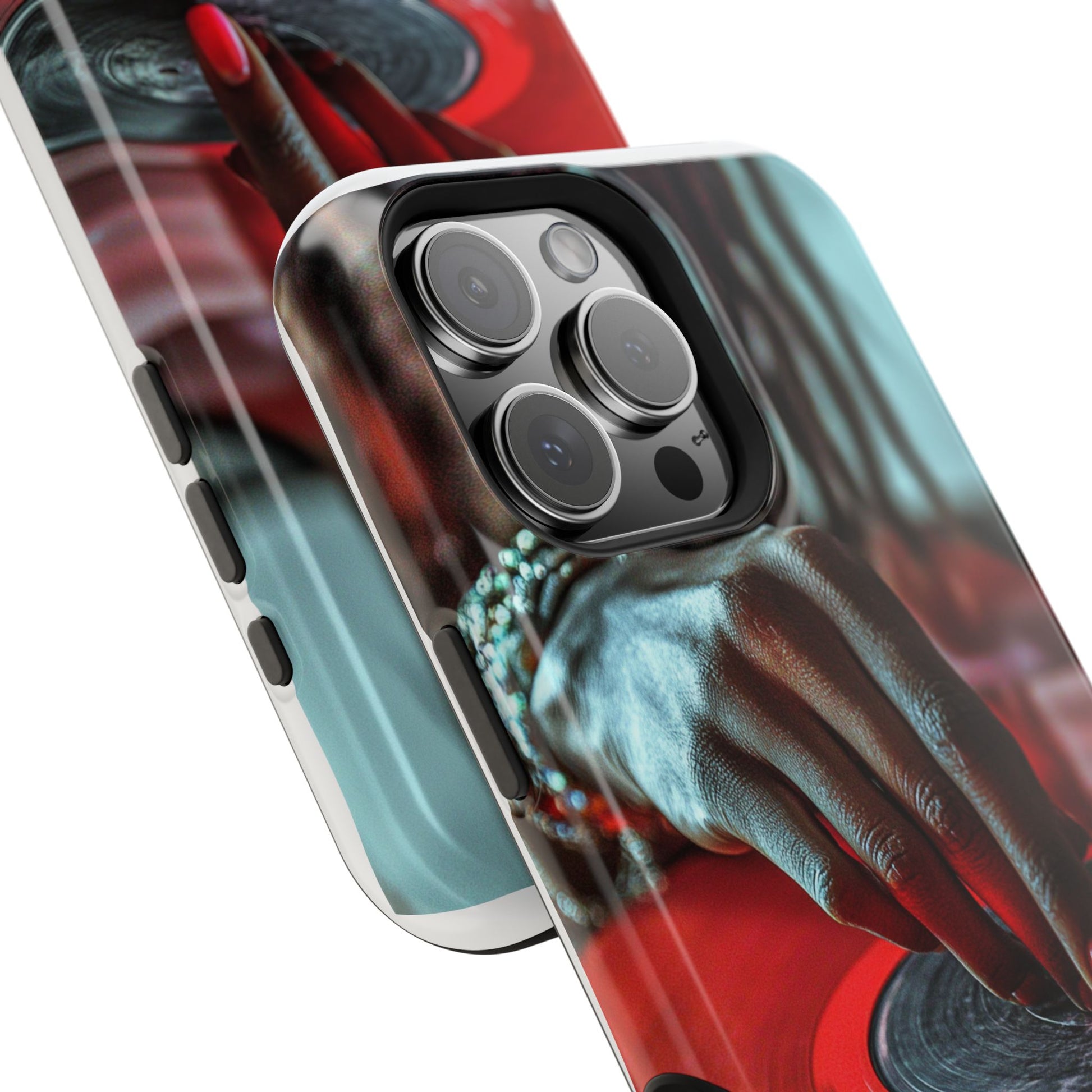 Elevate your iPhone's style with this stunning case featuring Moxie-Jay's captivating artwork "Vinyl Groove." This luxurious case showcases a close-up photograph of a woman's black hand scratching a vibrant red vinyl record, perfectly capturing the essence of music and artistry. The durable polycarbonate construction provides superior protection against scratches and impacts, while the built-in magnets ensure seamless MagSafe® compatibility for effortless wireless charging.This tough iPhone case offers: