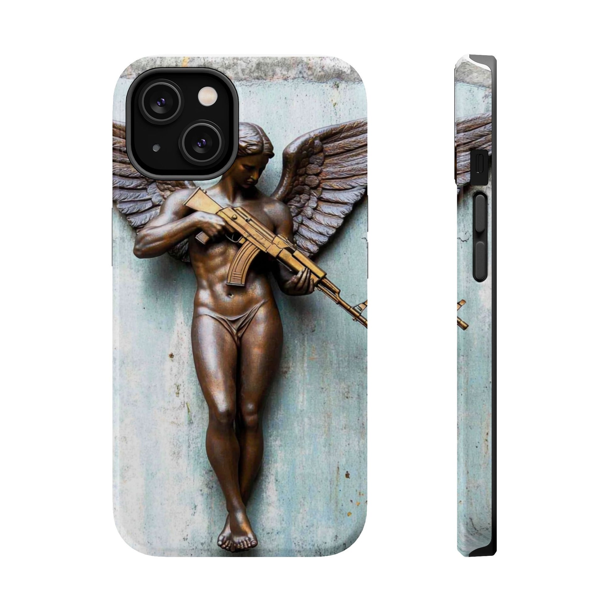 Add a touch of edgy style to your phone with this Magnetic Tough Phone Case featuring the angel of death holding his giant golden assault rifle. The vibrant colors and detailed design give off a unique and bold vibe, perfect for those who appreciate dark and unconventional artwork. Ideal for those looking to protect their phone in a durable and stylish way, this phone case is a great accessory for fans of gothic or alternative aesthetics. Perfect for Halloween, spooky vibes, or those who like to stand out from the crowd. Art done by world renowned Visual Artist Moxxxie J.