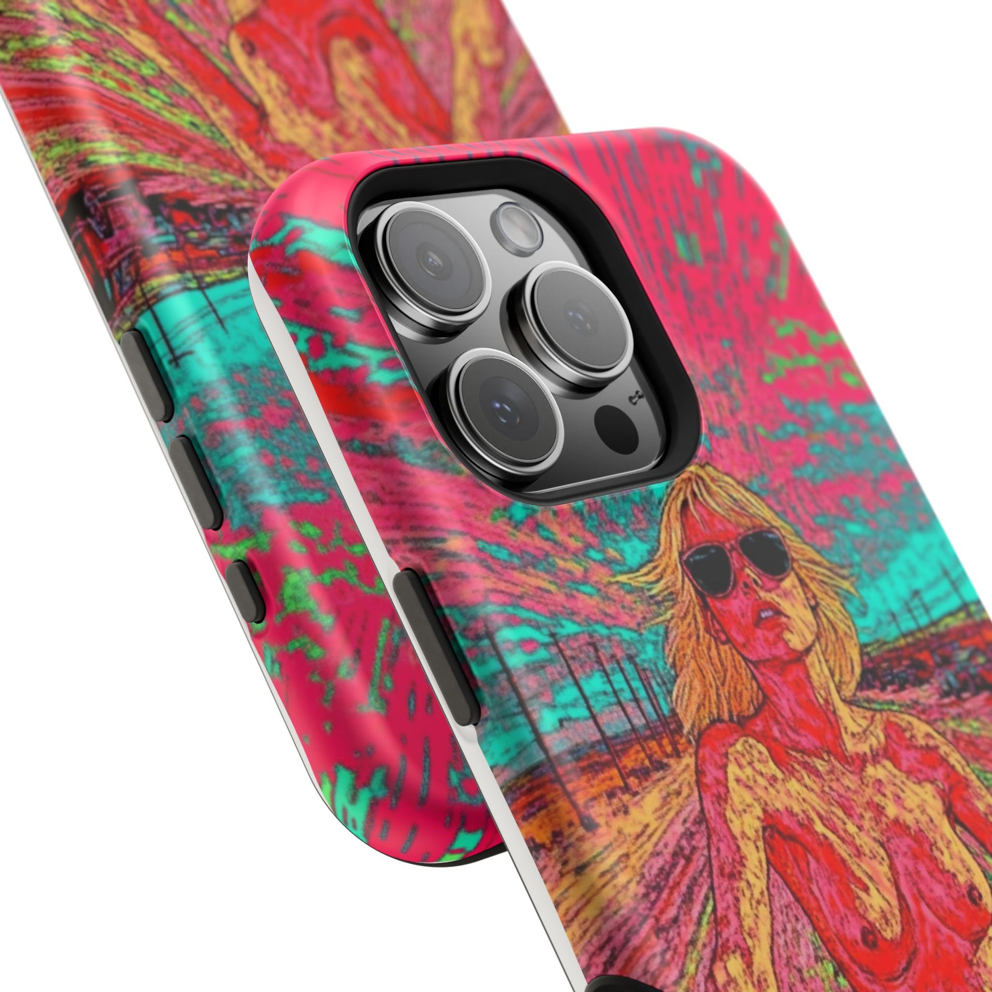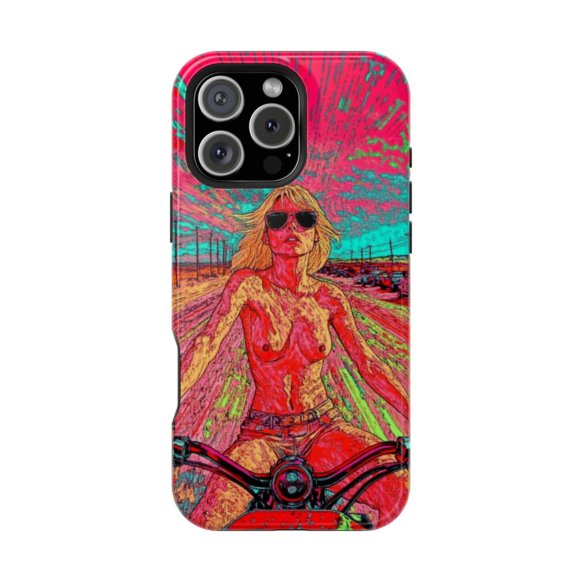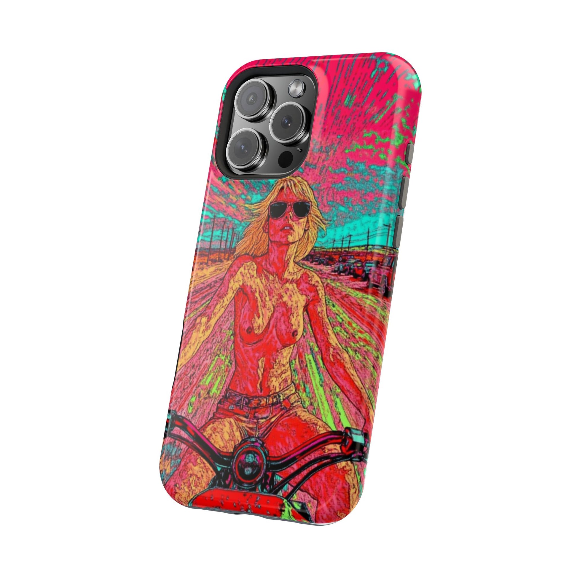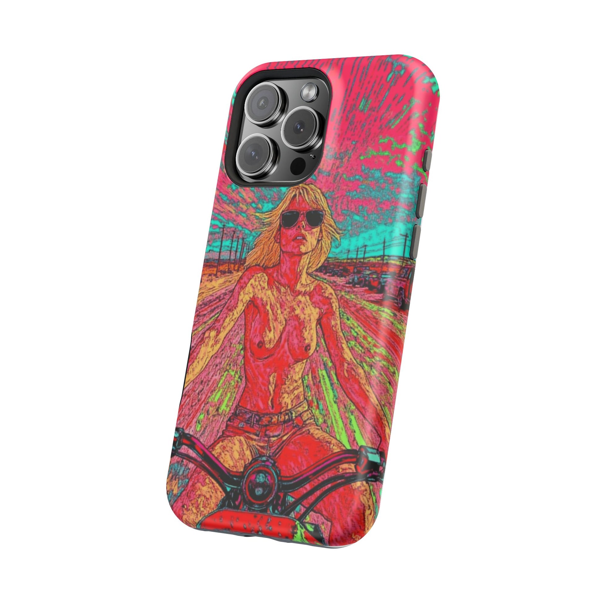 Luxurious magnetic tough phone cases featuring an authentic art piece of a topless woman riding her motorcycle down a barren street. The design exudes a sense of freedom and rebellion, making it perfect for individuals who love edgy and unique accessories. Ideal for bikers, art enthusiasts, and anyone looking to make a bold statement with their phone case. A great gift for birthdays, holidays, and special occasions.